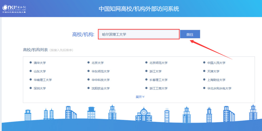 3.进入中国知网“中国知网高校/机构外部访问系统”页面(https://fsso.cnki.net)在“高校/机构”下拉框中选择或直接输入“哈尔滨理工大学”点击“前往”