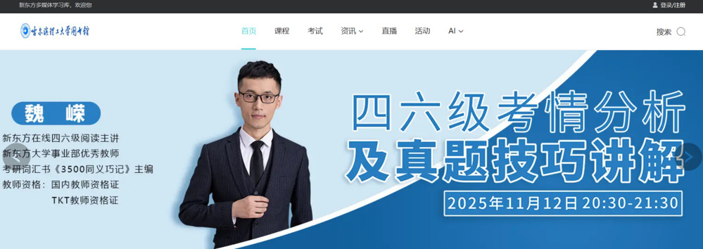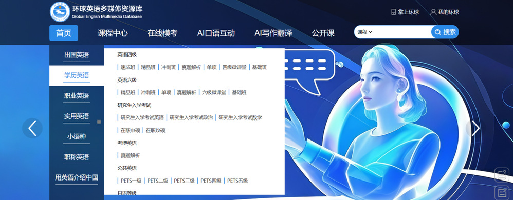 该数据库包含课程中心、考试中心、资讯中心、专项学习、直播课五大板块。内容涵盖国内考试类、出国留学类、小语种类、应用外语类、职业认证类、求职指导类、实用技能类等7大类,400多门课程,能够提供大学英语四级、六级、考研、出国考试类别题库及AI作文批改功能,试用时间至20251231日。