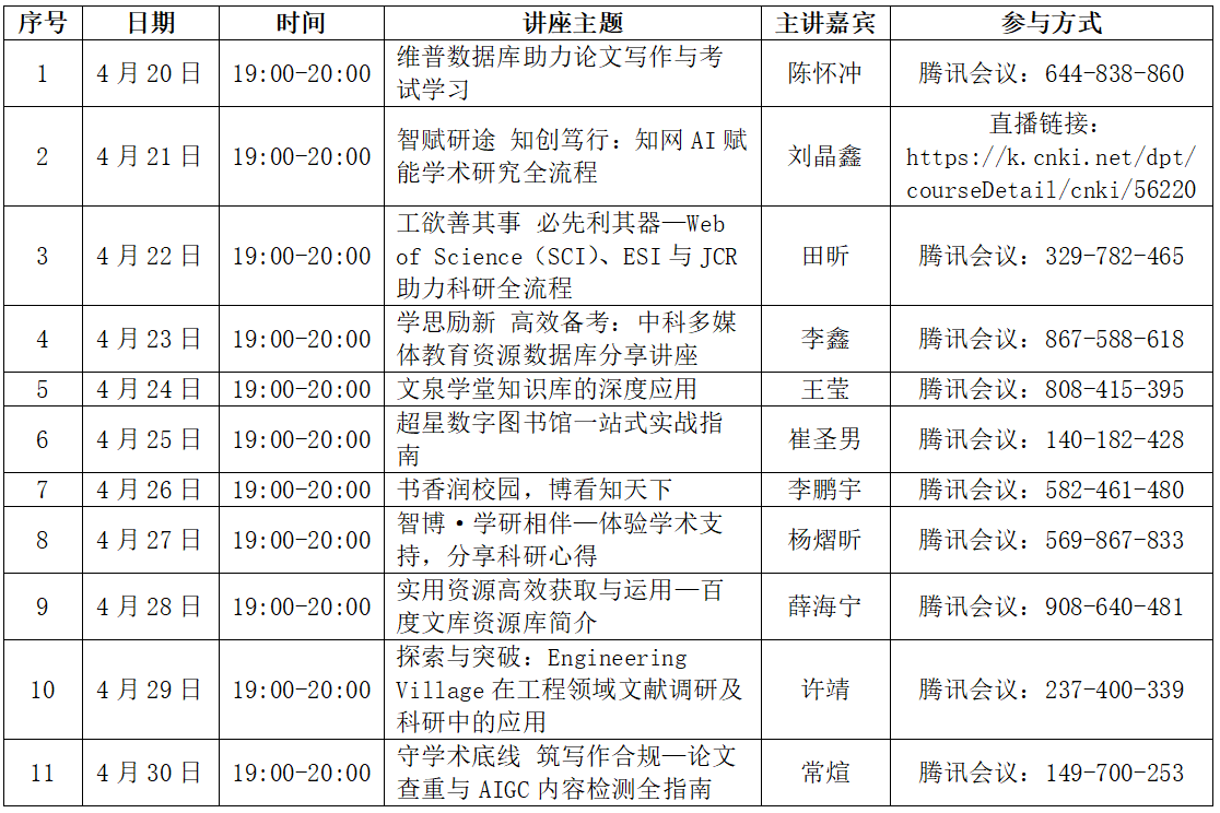 1.讲座涵盖数据库使用技巧、论文写作辅助、检索方法教学、文献获取等主题。具体安排如下: